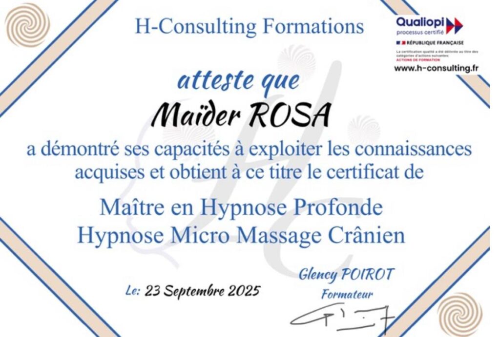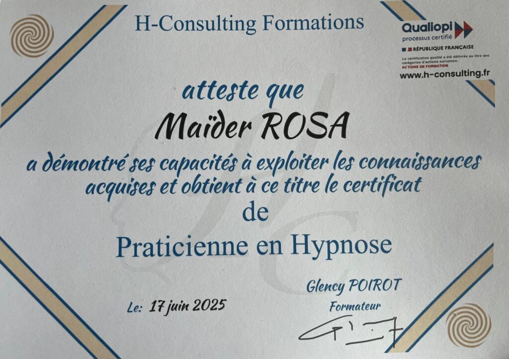 L’hypnose est arrivée tout naturellement car en modifiant la perception de l’inconscient, on avance beaucoup plus vite et facilement. Les formations certifiantes et Qualiopi ont été réalisées avec H-Consulting.